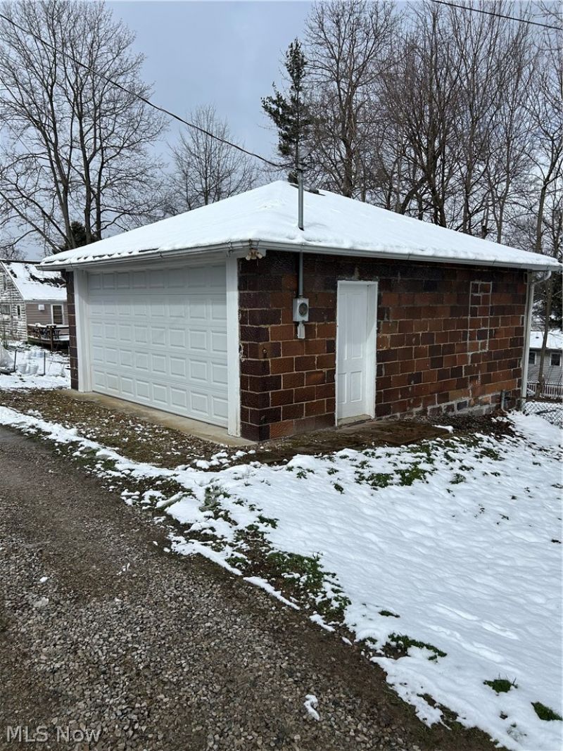 Detached two-car garage offering ample space for vehicle storage, workshop use, or additional storage needs. Solid block construction with overhead garage door and separate side entry for convenient access. Interior features include built-in shelving, workbench area, and electrical service. Concrete floor provides durability and easy maintenance.